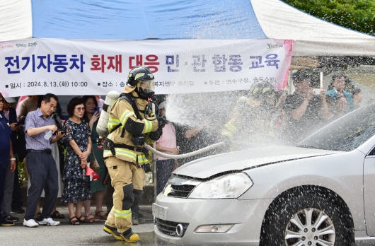[뉴스서울] 연수구는 13일 송도2동 행정복지센터 주차장에서 지역주민을 대상으로 인천송도소방서 미래119안전센터와 함께 전기차 화재 대응 민관 합동교육을 진행했다.