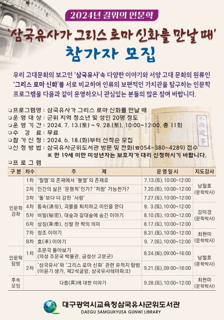 [뉴스서울] 삼국유사군위도서관은 2024년 길 위의 인문학 ‘삼국유사가 그리스 로마 신화를 만날 때’를 오는 7월 13일부터 9월 28일까지 11회에 걸쳐 운영한다.
