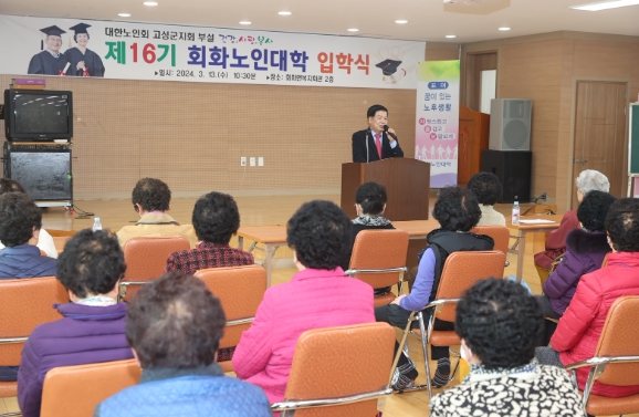 이상근 고성군수는 축사를 통해 “따뜻한 봄날, 대한노인회 고성군지회 부설 노인대학에 이어 오늘 입학식을 맞은 회화노인대학의 학생분들 모두 축하한다”라며 “노인의 건강에 도움을 주는 건전한 여가 활동과 유익한 교육을 위해 군에서도 지원을 아끼지 않겠다”라고 전했다.