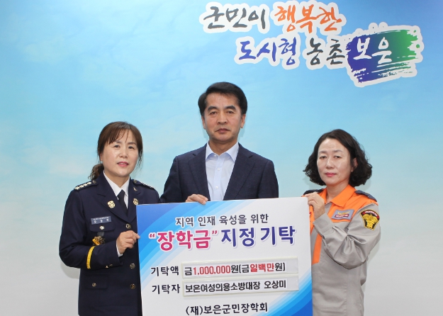 최재형 이사장(보은군수)은“보은군 학생들의 밝은 미래를 위해 따뜻한 마음으로 나눔을 결정해 주신 보은군여성의용소방대 오상미 대장님을 비롯한 회원들에게 감사하다”며 “기탁해 주신 장학금은 필요한 곳에 소중히 사용하겠다”고 말했다.