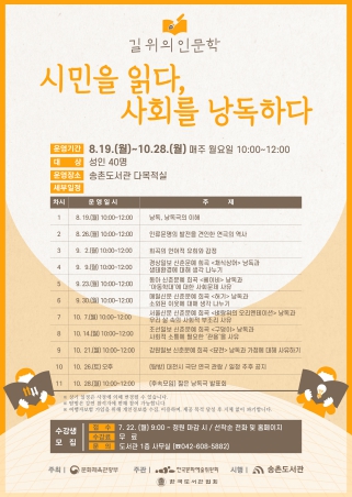 대덕구 송촌도서관에서 진행되는 길 위의 인문학은 성인을 대상으로 하며 8월 19일부터 10월 28일까지, 매주 월요일 오전 10시부터 12시까지 11회에 걸쳐 진행된다.