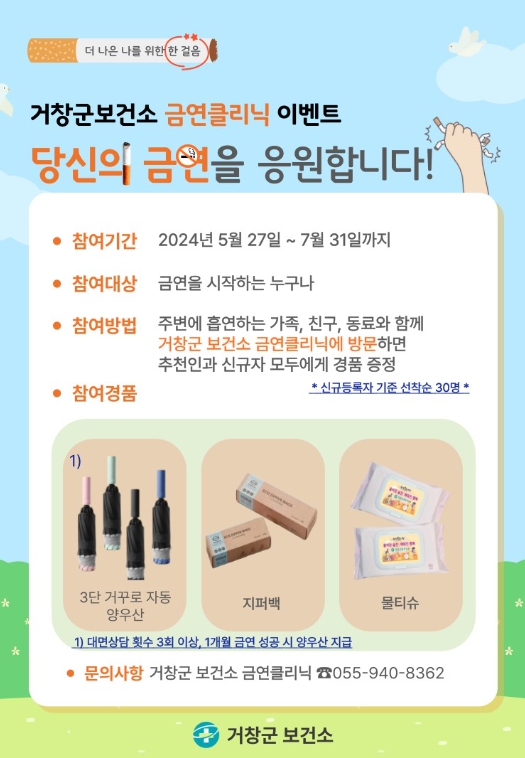 [뉴스서울] 거창군은 5월 31일인 ‘제37회 세계 금연의 날’을 기념해 보건소 금연클리닉에서 5월 27일부터 7월 31일까지 ‘당신의 금연을 응원합니다.’라는 주제로 이벤트를 진행한다.