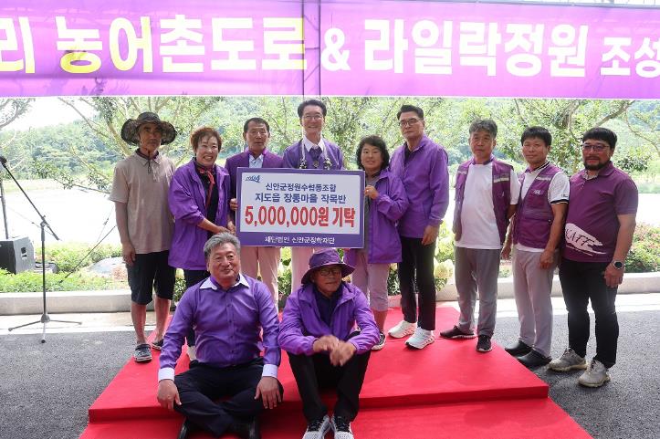 [뉴스서울] 신안군정원수사회적협동조합 지도읍 장동마을 작목반 임원과 회원들은 지난 15일 지도 장동에서 봉리 농어촌 도로·라일락 정원 준공식에서 (재)신안군장학재단에 장학기금 500만 원을 전달했다.