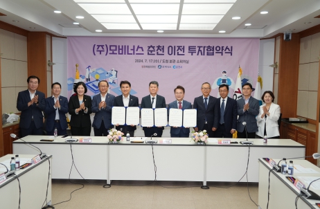 시에 따르면 17일 오전 9시 20분 강원특별자치도청 본관 소회의실에서 춘천시, 강원특별자치도, ㈜모비너스(대표 한병채)는 고밀도집적회로기판 제조공장 신설 투자협약을 체결했다.