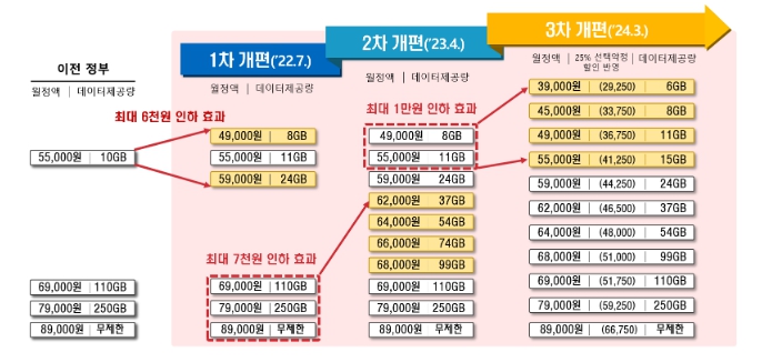 이번 정부 들어 고가 중심 5G 요금제를 중저가 중심으로 개편하는 한편 이용자가 실제 쓰는 만큼 요금을 낼 수 있도록 데이터 제공량을 세분화(’22.7월, ’23.4월, ’24.3월)했으며, 다양한 이용패턴을 반영하여 가격은 저렴하고 혜택이 강화된 청년ㆍ고령층ㆍ알뜰폰ㆍ온라인 요금제를 신설(’23.4월)했다.