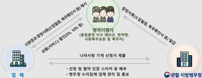 '나라사랑 가게'사업은 국가와 사회를 위해 헌신하는 병역이행자에게 긍지와 자부심을 갖게 하고, 병역이행자가 존중받는 사회분위기를 만들고자음식점, 숙박업소, 카페, 병원 등 크고 작은 기업과 개인사업자들의 자발적인 참여로 지난 해 8월부터 추진하고 있다.