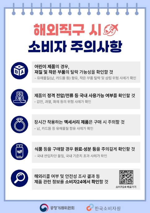 이에, 공정위와 소비자원은 해외직구로 제품을 구매할 때는 제품의 구성·성분 등을 주의 깊게 살피고, 소비자24 또는 소비자위해감시시스템을 통해 해외 리콜 정보 및 안전성 조사 결과도 확인할 것을 당부했다.
