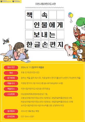 [뉴스서울] 이천시 어린이도서관은 ‘책 속 인물에게 보내는 한글 손 편지’ 공모전을 운영하며 참가자를 모집한다고 밝혔다.