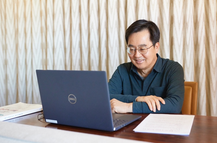 | ▲ 현지시각 14일 오전 미국에서 김동연 경기도지사가, 행정1·2부지사, 경제부지사, 경기도소방재난본부장과 현안 업무점검을 위한 영상 회의를 하고있다. |