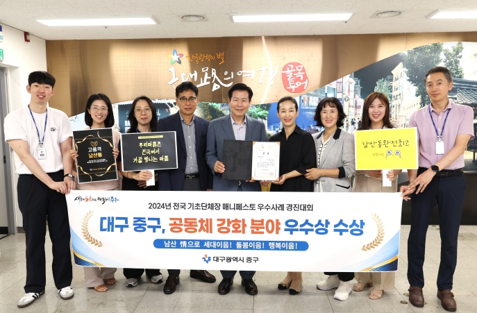 [뉴스서울] 대구 중구는 지난 31일 사)한국매니페스토실천본부와 경남연구원이 공동 주최한 ‘2024 전국 기초자치단체장 매니페스토 우수사례 경진대회’에서 ‘남산情으로 세대이음! 돌봄이음! 행복이음!’ 사례로 공동체 강화분야 우수상을 수상했다고 밝혔다.