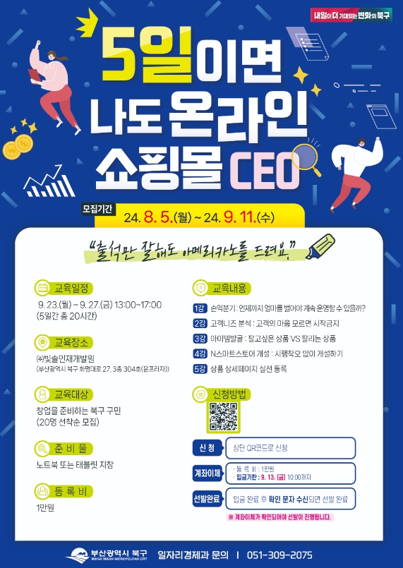 [뉴스서울] 부산 북구는 오는 9월 23일부터 27일까지 5일간 북구 구민을 대상으로‘5일이면 나도 온라인 쇼핑몰 CEO 창업교육’을 실시한다고 밝혔다.