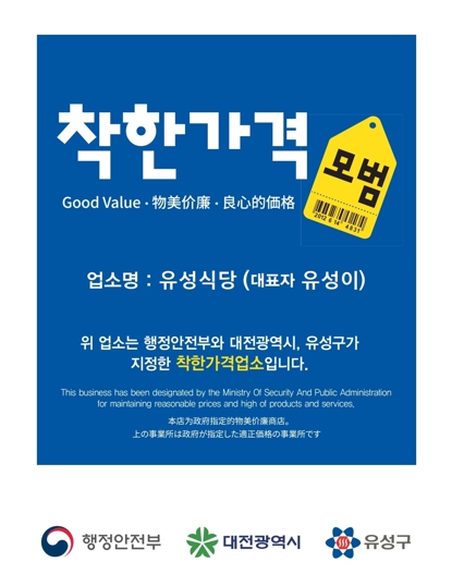 “착한가격업소”는 저렴한 가격으로 양질의 서비스를 제공하는 업소 중 정부와 지자체가 지역 물가안정을 위해 지정하여 관리하는 업소로, 현재 유성구에는 55개소가 지정돼 있다.
