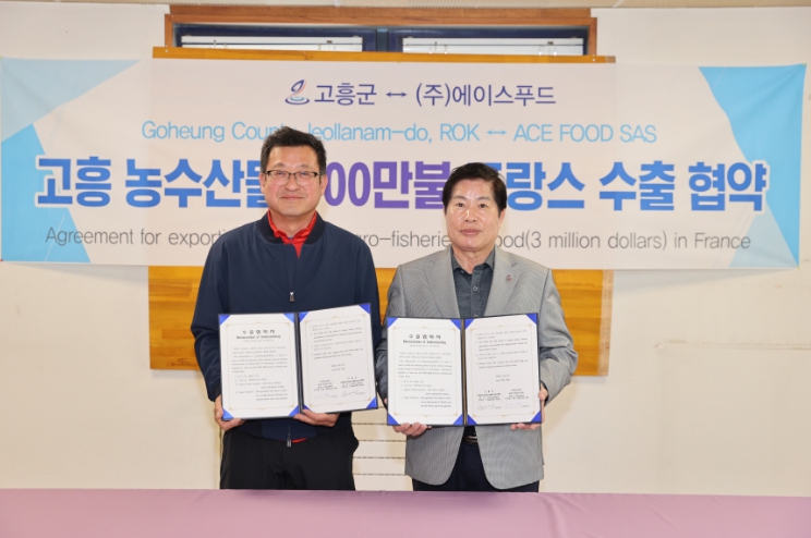 고흥군 농수산물 유럽 수출개척단은 프랑스에서 ▲(주)리엔코(RIZ ET CO SAS) 200만 불 ▲㈜에이스푸드(ACE FOOD SAS) 300만 불 수출협약 ▲ 프랑스 명장 요리사 협회(Maîtres Cuisiniers de France) 고흥 농수산물 공동마케팅 업무협약을 체결했다.