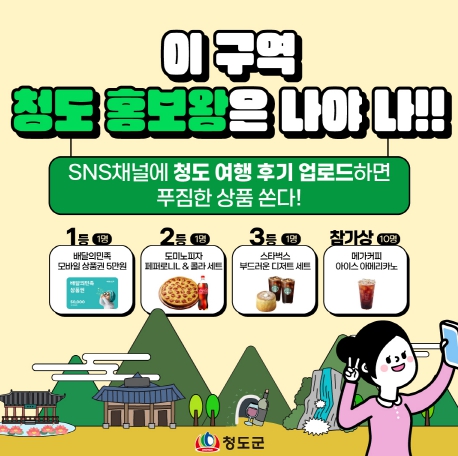 [뉴스서울] 청도군은 이번 달 6일부터 31일까지 문화관광 공식 SNS를 통해 ‘이 구역 홍보왕은 나야 나!’ 이벤트를 진행한다.