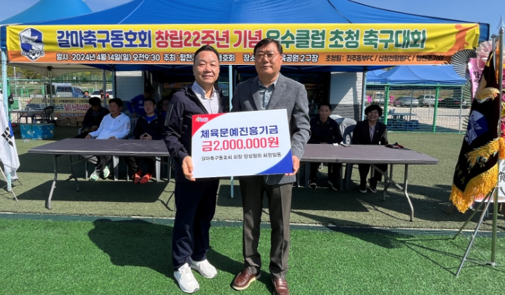 [뉴스서울] 합천 갈마축구동호회는 지난 14일 군민체육공원 인조구장에서 열린 창립 22주년 기념 우수클럽 초청 축구대회에서 합천군 체육발전 및 인프라 확충을 위해 써달라며 체육문예진흥기금 2백만원을 기탁했다.