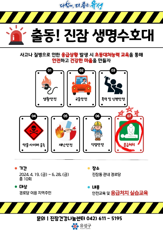 ‘출동! 진잠 생명수호대’는 사고나 질병으로 인한 응급상황 발생 시 어르신들의 초동대처능력을 향상시키기 위해 유성구 진잠건강나눔센터와 안전전문가가 경로당 이용 어르신들에게 ▲7대 안전교육 ▲심폐소생술 실습교육 ▲기초건강측정 ▲개인별 맞춤형 건강상담 등 다양한 건강안전관리 교육을 제공한다.