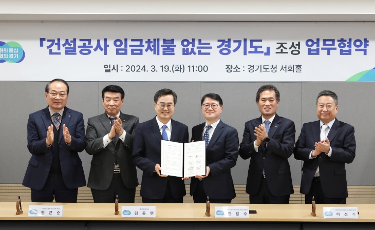 김동연 지사는 19일 경기도청 서희홀에서 민길수 중부지방고용노동청장, 황근순 대한건설협회 경기도회장, 이성수 대한전문건설협회 경기도회장, 이용술 대한기계설비건설협회 경기도회장, 홍성호 대한건설기계협회 경기도회장과 ‘건설공사 임금체불 없는 경기도 조성을 위한 업무협약’을 체결했다.