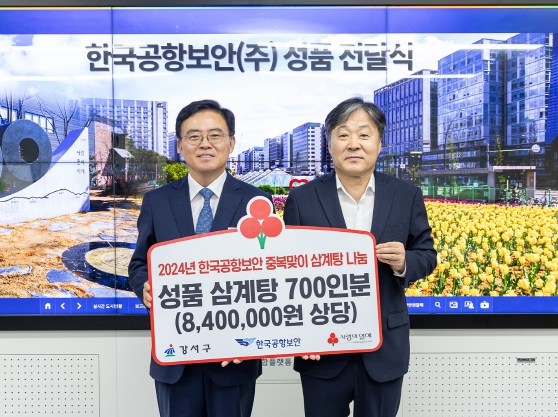 구는 22일 구청에서 ‘삼계탕 전달식’을 열고 한국공항보안(주)로부터 삼계탕 밀키트 700개를 전달받았다.