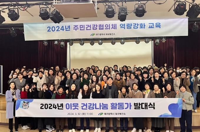대구 북구보건소는 3월 12일 북구청소년회관 아트홀에서 주민건강협의체 위원 86명을 대상으로 이웃 건강나눔 활동을 위한 건강 역량강화 교육을 실시하고 ‘이웃 건강나눔 활동가’ 위촉 및 건강나눔 실천을 다짐하는 발대식을 개최했다.