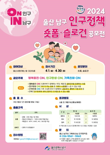 [뉴스서울] 울산 남구는 결혼과 출산에 대한 인식개선과 출산장려 분위기 확산을 위해 참신하고 독창적인 구민제안을 발굴하고자‘ON 인구, IN 남구’2024 울산남구 인구정책 공모전을 개최한다고 12일 밝혔다.