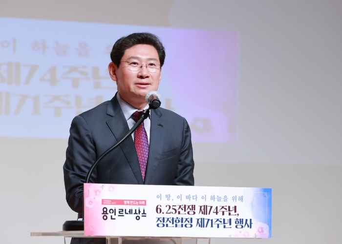 | ▲ 25일 용인특례시청 에이스홀에서 열린 6.25전쟁 제74주년·정전협정 제71주년 행사에서 인사말을 하고 있는 이상일 시장 |