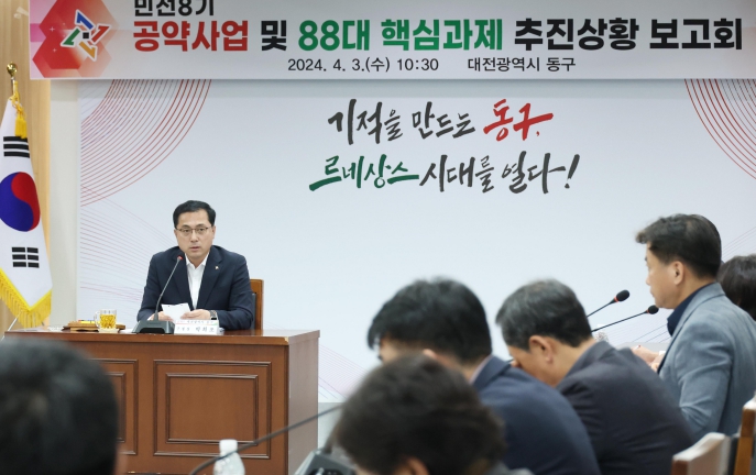 [뉴스서울] 대전 동구는 3일 구청 대회의실에서 박희조 동구청장 주재로 ‘민선 8기 공약사업 및 핵심과제 추진 상황 보고회’를 개최하고, 주요 사업을 면밀히 점검했다.