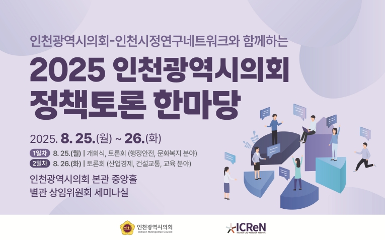 [뉴스서울] 인천광역시의회는 시민의 행복과 더 나은 지역사회 발전을 위해 참신하고 다양한 정책 발굴 및 제안의 장인 ‘2025 인천광역시의회 정책토론 한마당’을 오는 25일부터 26일까지 이틀 동안 개최한다.