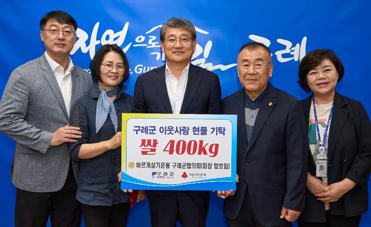 바르게살기운동 구례군협의회는 지난 5월 30일 회장 이․취임식 행사 때 화환 대신 받은 쌀을 어려운 이웃을 위해 기탁했다.