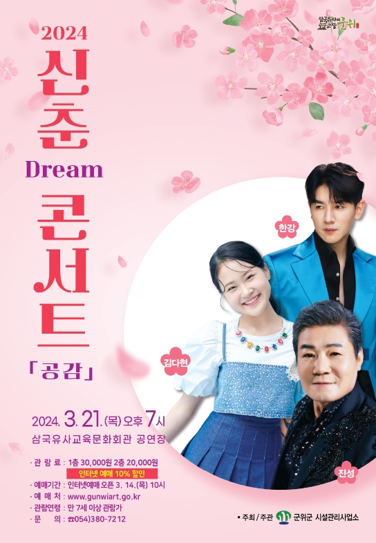 김진열 군위군수는 "따스한 봄을 맞아 온 힘을 다해 꽃망울을 터트리는 봄꽃의 강인한 에너지와 같이 삼국유사교육문화회관 2024년 신춘 Dream콘서트를 통해 꿈과 희망을 품을 수 있는 마음의 에너지를 가득 충전해 가시기 바란다"고 말했다.