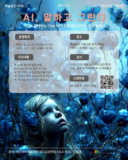 이번 프로그램은 미티어아트 시각예술가이자 예술공간 이아 레지던시 입주작가 이쥬가 진행하는 지역 연계 프로그램의 일환으로, 대화형 AI와 이미지 생성형 AI를 직접 체험하며 창의적 표현을 확장하는 실습형 워크숍이다. 주요 내용은 ▲AI의 원리와 역사 이해 ▲효과적인 AI 질문법 실습 ▲이미지 생성형 AI 서비스(DALL·E, Midjourney 등) 활용법 ▲프롬프트 작성 실습 및 나만의 이미지 제작 ▲작품 공유와 피드백 등으로 구성된다.