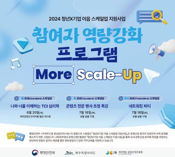 [뉴스서울] 제주영상‧문화산업진흥원은 지난 6월 20일과 7월 18일, 두 차례에 걸쳐 도내 콘텐츠 산업에 종사하는 청년들을 위한 역량강화 프로그램 '모어 스케일업(More Scale-Up)'을 성공적으로 마무리했다.