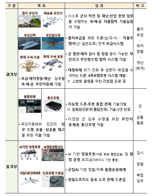 특히, 육·해·공 무인 이동체의 자율협업(항우연·기계연·선박 해양 플랜트 연구소'KRISO')과 다수·이기종 무인 이동체 통합관제(한국 전자 기술원) 기술은 해양 분야에서는 무인선과 자율잠수정이 협업하여 수심 1km 해저 지형을 관측하고 3차원 지도를 제작하는 기술(해양 플랜트 연구소), 해안에서 30km 이상 떨어진 섬 등에 무인기(드론)와 무인 이동차가 협업해 화물을 배송하는 기술(항우연·기계연·DMI) 등은 세계 최고 수준의 기술을 구현해 냈다는 평가를 받는 기술로 주목을 받았다.