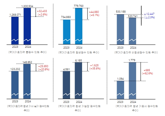 한편, 정보처리기사, 위험물산업기사, 건축기사 등 기사 시험에 응시하는대학생 등 취업준비 청년층이 큰 폭으로 증가했다. 2024년 제1회 기사 실기시험 청년 접수자가 지난해에 비해 25,650명(+20.8%) 증가했다.