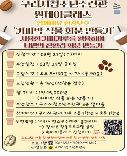 [뉴스서울] 구리시청소년재단 청소년수련관은 환경보호의 일환으로, 사용한 커피 가루를 활용해 나만의 친환경 화분을 만드는 문화창작교실 ‘커피박 식물 화분 만들기’를 오는 3월 29일에 운영한다.