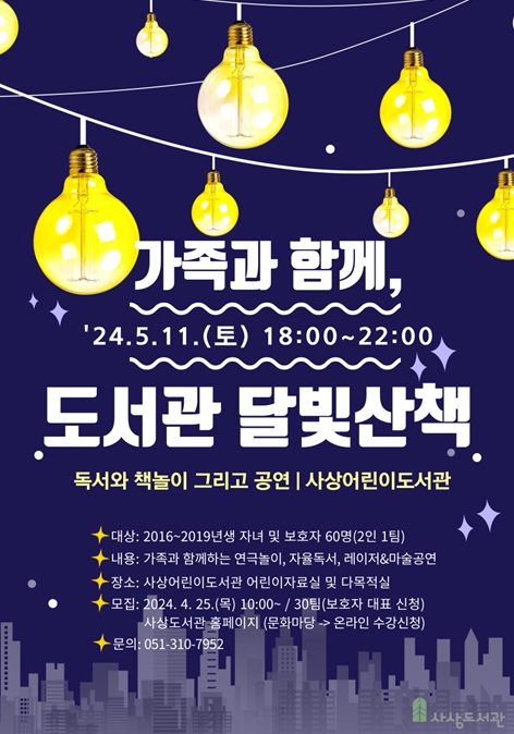 [뉴스서울] 부산 사상도서관은 오는 5월 11일 4~7세 자녀와 부모가 함께 참여할 수 있는 가족친화 독서문화 행사인‘가족과 함께, 도서관 달빛산책(冊)’을 운영한다고 24일 밝혔다.
