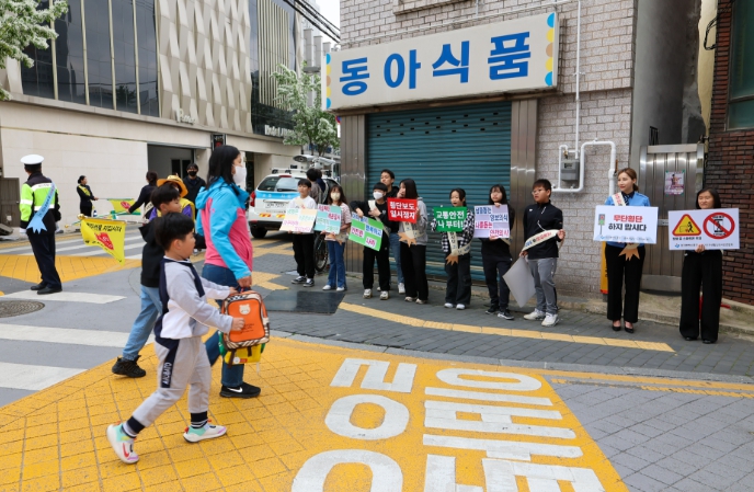 이번 캠페인은 힐스테이트대구역 아파트 주변과 북성로 일원의 안전한 등굣길 조성을 위해 어린이 교통안전지도, 불법 주‧정차 계도, 어린이 교통사고 예방 수칙을 안내하고 칼라밴드 등 홍보 물품을 제공했다.