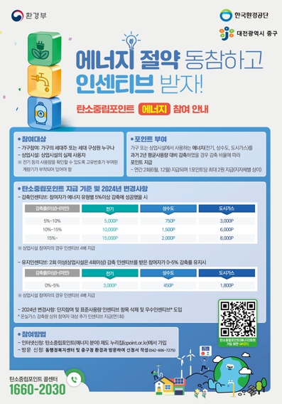 [뉴스서울] 대전 중구는 2023년 하반기 에너지 사용량을 감축하여 탄소중립 생활실천에 기여한 탄소중립포인트제 에너지분야 참여자에게 인센티브를 지급한다고 밝혔다.