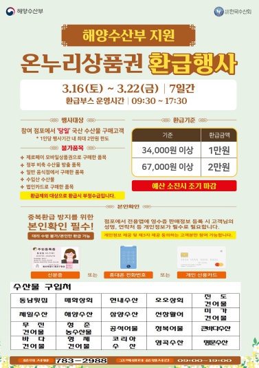 행사 기간 내에 울진바지게시장 내 수산물 판매 점포(20개소)에서 국내산 수산물을 구매한 고객 대상으로 온누리 상품권을 환급한다.