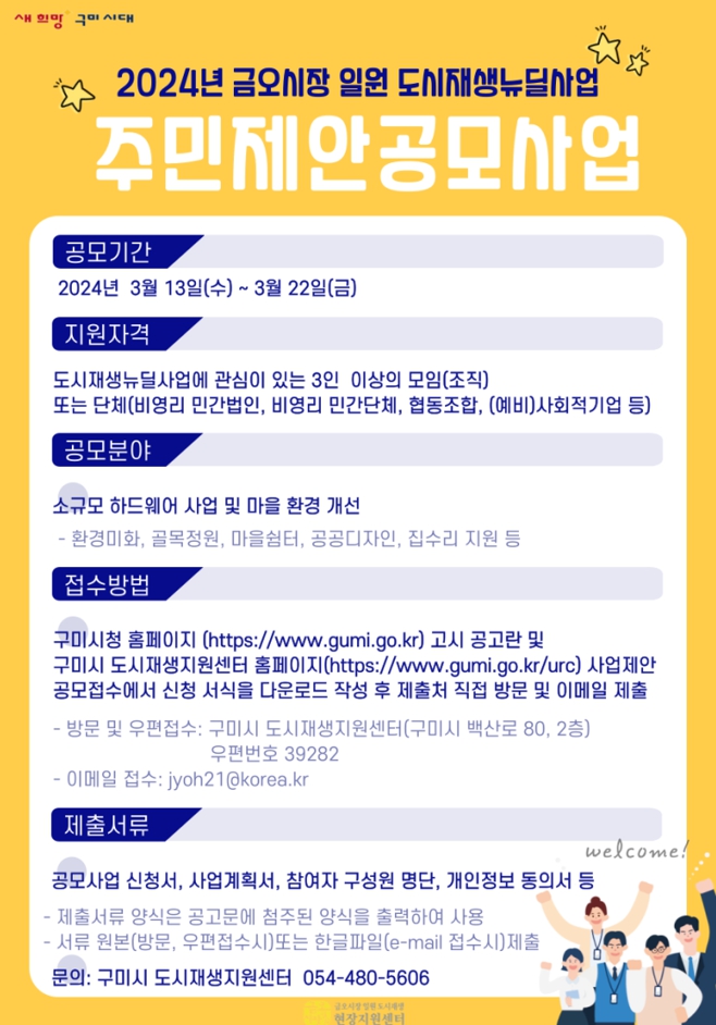 신청은 시청 누리집에서 공고문을 내려받아 작성 후 금오시장 일원 도시재생현장지원센터를 방문하거나 이메일로 제출하면 된다. 기타 공모사업 관련한 자세한 사항은 구미시 도시재생지원센터로 문의하면 된다.