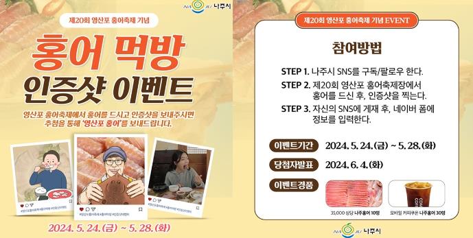 [뉴스서울] 전라남도 나주시는 제20회 영산포 홍어축제 기간 홍어 먹방 SNS인증 이벤트를 방문객 40명을 대상으로 진행한다고 23일 밝혔다.