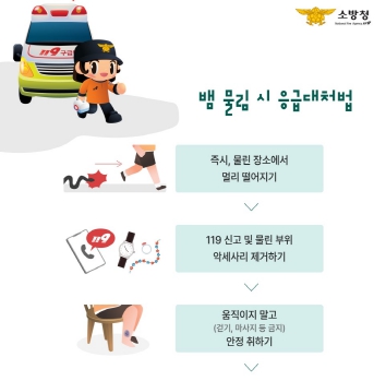 소방본부 관계자에 따르면 뱀에게 물렸을 때는 물린 장소에서 즉시 벗어나 119에 신고하기, 반지나 시계 등 액세서리 제거하기, 깨끗한 물이 있다면 물린 부위를 씻어내기, 물린 부위에서 2∼3㎝ 윗부분을 거즈와 붕대로 감기, 옆으로 눕는 자세 취해주기 등의 응급조치를 해야한다.