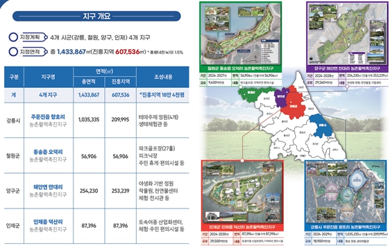 심의 예정지구는 총 4개 지구로 강릉 향호 지방정원, 철원 학저수지 체육시설, 양구 해안면 지방정원, 인제 토속어종 산업화센터이며, 총 사업부지 43만 평(143 헥타르)중 농업진흥지역은 18만 평(61헥타르, 축구장 85개)으로 43%에 달한다.