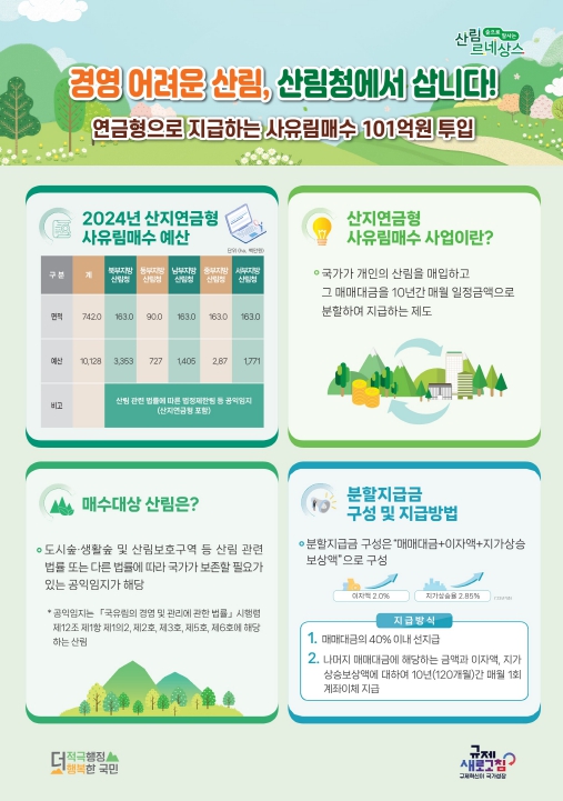 ‘산지연금형 사유림 매수사업’은 산주에게 매매대금을 10년간(120개월) 매월 지급하는 제도로 연금처럼 안정적 노후생활을 지원하기 위해 ’21년 시범 추진 이후 ’22년부터 본격적으로 시행되고 있다.