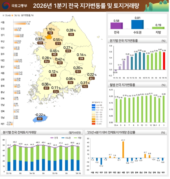 [뉴스서울] 국토교통부와 한국부동산원(원장 이헌욱)은 '26년 1분기 지가변동률 및 토지거래량을 발표했다.