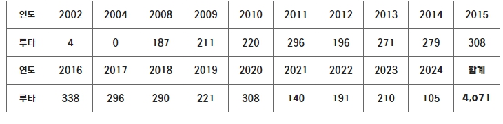 지난 4월 17일 개인 통산 4,000루타 달성 후, 9일 현재 통산 4,071루타를 기록 중인 최형우는 최다 루타 1위 이승엽(전 삼성)의 4,077루타에 6루타 차이로 다가서며, 신기록까지는 7루타를 남겨두고 있다.