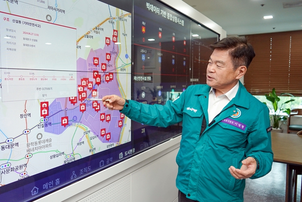 ▲ 이필형 동대문구청장이 빅데이터 기반 종합상황시스템을 활용해 재난안전 상황을 확인하고 있다. |