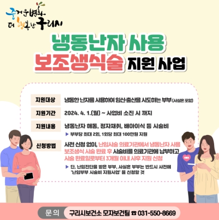 ‘냉동난자 사용 보조생식술 지원사업’은 가임력 보존을 목적으로 냉동한 난자를 임신·출산을 위해 사용할 경우 보조생식술 비용의 일부를 지원하는 사업으로, 냉동한 난자를 해동해 보조생식술로 임신하고자 하는 구리시 거주 부부가 사업 대상이다.