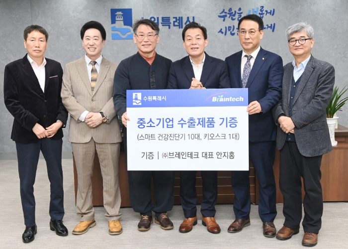 ㈜브레인테크 안지홍 사장은 4일 수원시청을 방문해 이재준 수원시장에게 소변분석 건강진단기 10대와 키오스크 1대를 전달했다.
