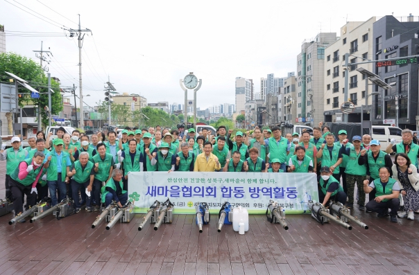 ▲ 서울시 첫 말라리아 경보에 따라 서울 성북구가 선제적인 대응을 펼치고 있다. 지난 5일 이승로 성북구청장(가운데 노란점퍼)과 주민자율방역단이 민관 합동 방역활동에 앞서 기념사진을 찍고 있다. |