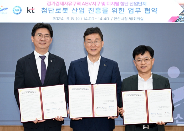 안산시는 5일 오후 안산시청 제1회의실에서 KT, 한양대학교 ERICA와 함께 ‘경기경제자유구역 안산사이언스밸리 및 디지털 첨단산업단지의 ‘첨단로봇 산업 진흥’을 위한 공동 업무협약을 체결했다고 밝혔다.